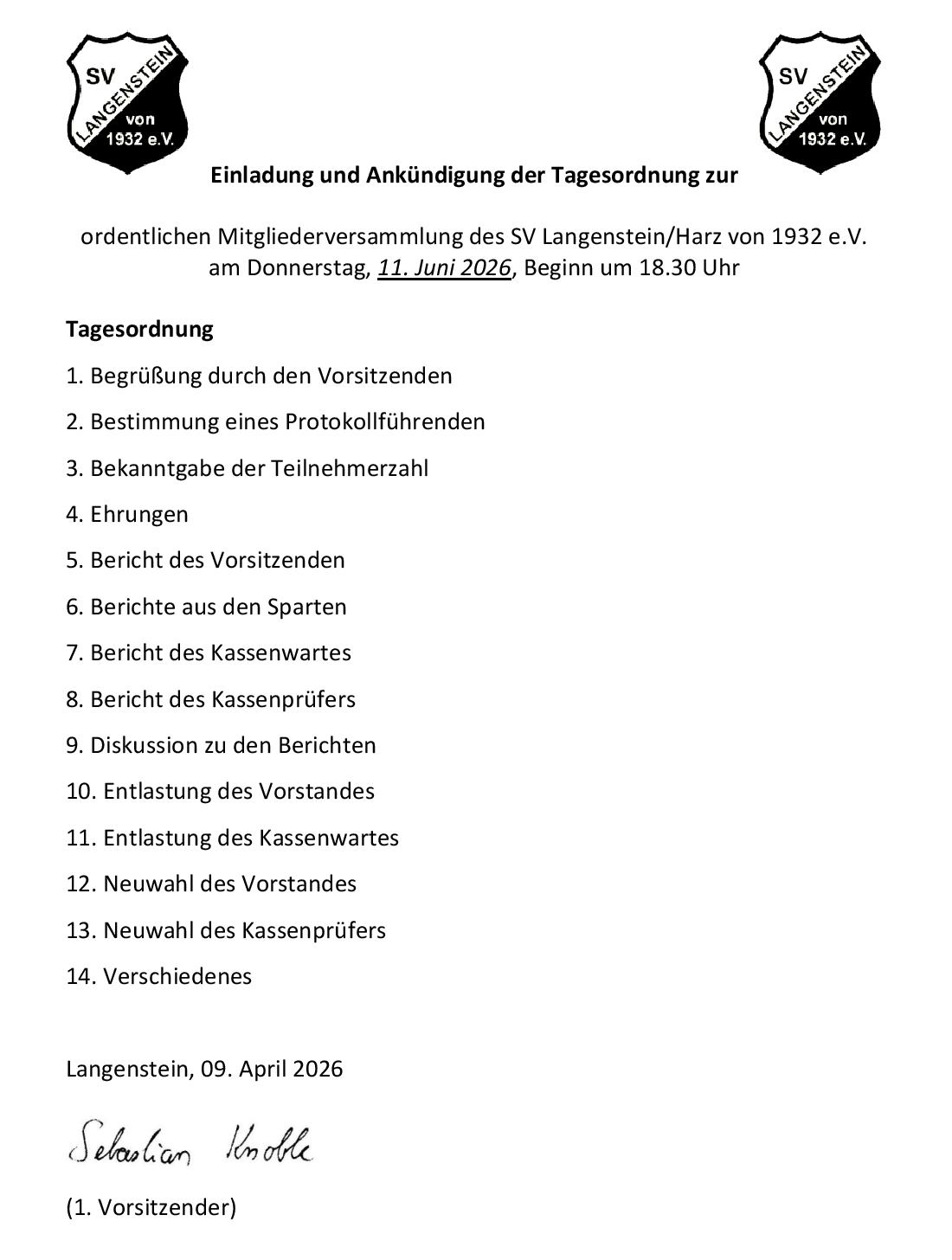 Ende April fand im Sportlerheim im Maiwinkel die diesjährige Mitgliederversammlung des SV Langenstein von 1932 e.V. statt. Bei sehr guter Beteiligung der Mitglieder gehörten neben den jeweiligen Berichten aus der Vereinsarbeit u.a. auch die Neuwahlen des Vereinsvorstandes zu den Eckpfeilern der Tagesordnung. Letztere standen dabei klar im Zeichen der Fortführung der kontinuierlichen Vereinsentwicklung. So ist der neue Vorstand nahezu unverändert: Für Patrick Koch, der den Vorstand schon Ende 2023 verlassen hatte, rückt mit Wolfgang Baake ein Langensteiner Urgestein neu bzw. wieder in den Vereinsvorstand auf, der die Geschicke des Vereins selbst schon viele Jahre als Vorsitzender geführt hat. "Wolfgang wird mit seiner Erfahrung und seinen Ideen die Vereinsarbeit in den kommenden Jahren erheblich bereichern.", so der alte und neue Vereinsvorsitzende Sebastian Knobbe. Darüber hinaus gehören auch André Bergfeld (stellv. Vorsitzender) und Mathias Mook (Kassenwart) weiter zum Vorstand. Als Beisitzer wurden abermals Gordon Ferdenus, Matthias Pokorny, Marcel Knakowski, Christian Stosch und David Uthe gewählt. Wir sagen herzlichen Glückwunsch und wünschen dem Vorstand viel Erfolg für die zukünftige Vereinsarbeit.